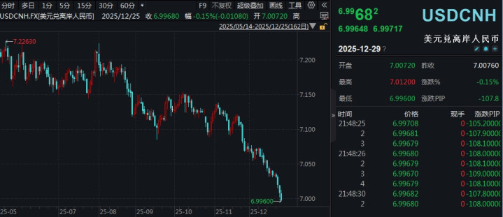 25日,离岸人民币兑美元走强,截至发稿涨0.15%,报6.9968,创年内新高。今年以来,离岸人民币兑美元汇率持续走强,从低位超7.4元一路走强升破7元关口。