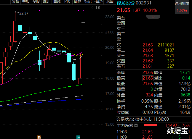 今日(12月25日)上午,机器人相关题材大幅异动,减速器、人形机器人、汽车配件、宇树机器人等概念板块均涨超1%。个股方面,昊志机电、强瑞技术、拓斯达等上午收盘均涨超10%,龙溪股份、大业股份、天奇股份等个股涨停。新晋机器人题材的锋龙股份一字涨停,集合竞价后封单一度接近460万手,该公司流通股仅两亿股出头,意味着其流通盘远远不够卖。截至上午收盘,该股仍有超两百万手封单。