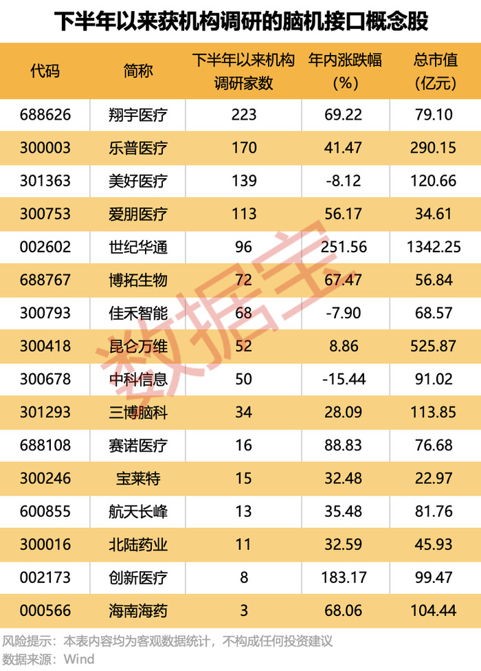 下半年以来,有16只脑机接口概念股获得机构调研,翔宇医疗、乐普医疗、美好医疗、爱朋医疗获调研机构在100家以上。
